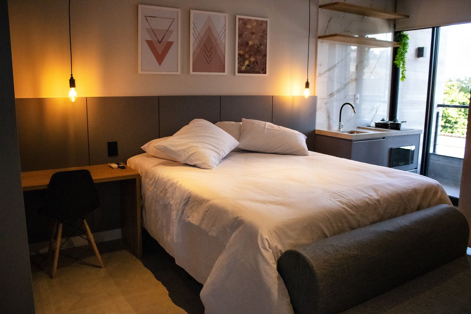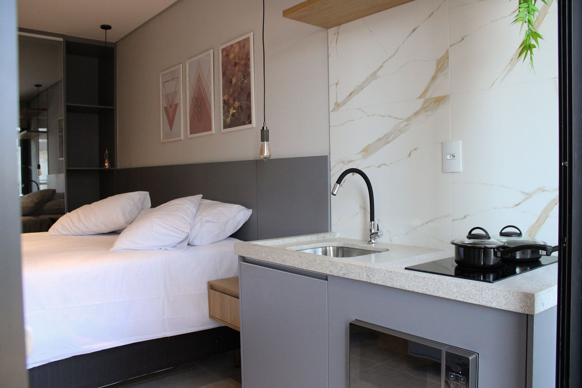 - Contamos com 6 apartamentos, ambos de 26m² (ambiente integrado: quarto, cozinha, banheiro e varanda).